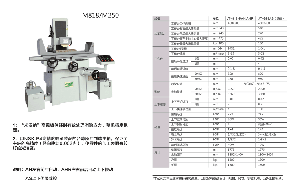AHD:前后、左右及上下三轴均为自动操作,上下进给可先预设进给量和进给次数,工作完毕后机床自动停止